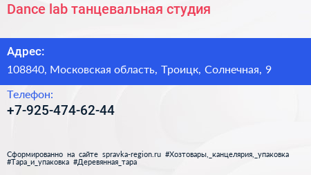 Dance.lab, танцевальная студия по адресу 108840, Московская область, Троицк, Солнечная, 9 в дальнейшем Организация, размещена в следующих категориях: