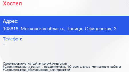 Хостел по адресу 108818, Московская область, Троицк, Офицерская, 3 в дальнейшем Организация, размещена в следующих категориях: