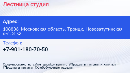 Лестница, студия по адресу 108836, Московская область, Троицк, Нововатутинская 6-я, 3 к2 в дальнейшем Организация, размещена в следующих категориях: