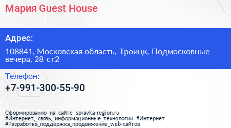 Мария Guest House по адресу 108841, Московская область, Троицк, Подмосковные вечера, 28 ст2 в дальнейшем Организация, размещена в следующих категориях: