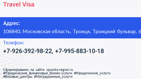 Travel & Visa по адресу 108840, Московская область, Троицк, Троицкий бульвар, 6 в дальнейшем Организация, размещена в следующих категориях: