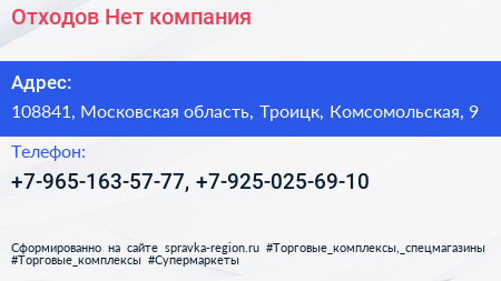 Отходов Нет, компания по адресу 108841, Московская область, Троицк, Комсомольская, 9 в дальнейшем Организация, размещена в следующих категориях: