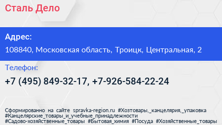 Сталь-Дело по адресу 108840, Московская область, Троицк, Центральная, 2 в дальнейшем Организация, размещена в следующих категориях: