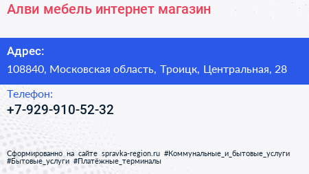 Алви мебель, интернет-магазин по адресу 108840, Московская область, Троицк, Центральная, 28 в дальнейшем Организация, размещена в следующих категориях: