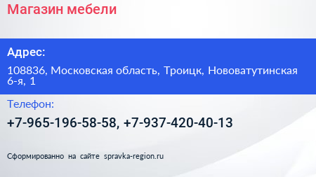 Магазин мебели по адресу 108836, Московская область, Троицк, Нововатутинская 6-я, 1 в дальнейшем Организация, размещена в следующих категориях: