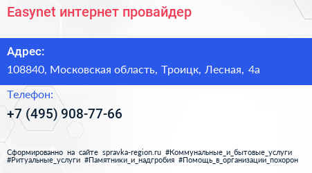 Easynet, интернет-провайдер по адресу 108840, Московская область, Троицк, Лесная, 4а в дальнейшем Организация, размещена в следующих категориях: