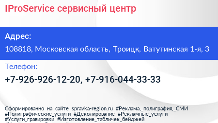 IProService, сервисный центр по адресу 108818, Московская область, Троицк, Ватутинская 1-я, 3 в дальнейшем Организация, размещена в следующих категориях: