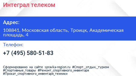 Интеграл телеком по адресу 108841, Московская область, Троицк, Академическая площадь, 4 в дальнейшем Организация, размещена в следующих категориях: