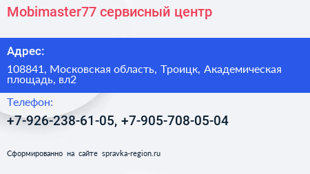 Mobimaster77, сервисный центр по адресу 108841, Московская область, Троицк, Академическая площадь, вл2 в дальнейшем Организация, размещена в следующих категориях: