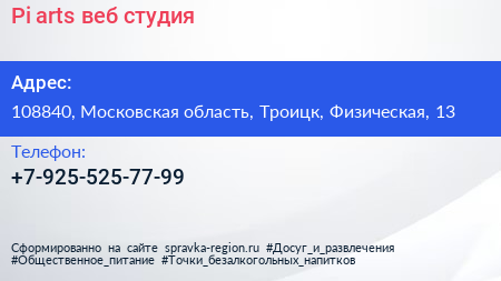 Pi-arts, веб-студия по адресу 108840, Московская область, Троицк, Физическая, 13 в дальнейшем Организация, размещена в следующих категориях: