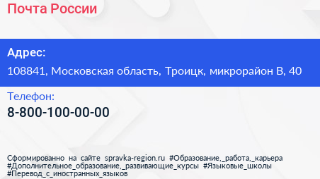 Почта России по адресу 108841, Московская область, Троицк, микрорайон В, 40 в дальнейшем Организация, размещена в следующих категориях: