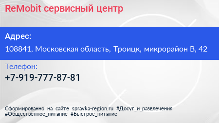 ReMobit, сервисный центр по адресу 108841, Московская область, Троицк, микрорайон В, 42 в дальнейшем Организация, размещена в следующих категориях: