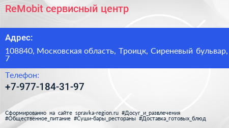ReMobit, сервисный центр по адресу 108840, Московская область, Троицк, Сиреневый бульвар, 7 в дальнейшем Организация, размещена в следующих категориях: