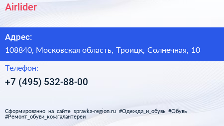 Airlider по адресу 108840, Московская область, Троицк, Солнечная, 10 в дальнейшем Организация, размещена в следующих категориях: