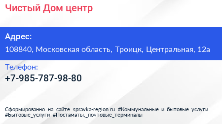 Чистый Дом, центр по адресу 108840, Московская область, Троицк, Центральная, 12а в дальнейшем Организация, размещена в следующих категориях: