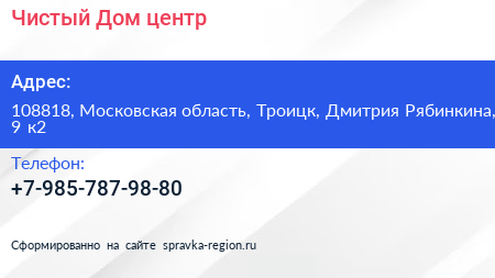 Чистый Дом, центр по адресу 108818, Московская область, Троицк, Дмитрия Рябинкина, 9 к2 в дальнейшем Организация, размещена в следующих категориях: