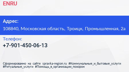 ENRU по адресу 108840, Московская область, Троицк, Промышленная, 2а в дальнейшем Организация, размещена в следующих категориях: