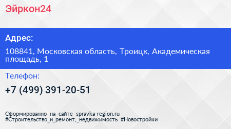 Эйркон24 по адресу 108841, Московская область, Троицк, Академическая площадь, 1 в дальнейшем Организация, размещена в следующих категориях: