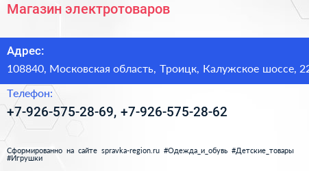 Магазин электротоваров по адресу 108840, Московская область, Троицк, Калужское шоссе, 22 в дальнейшем Организация, размещена в следующих категориях: