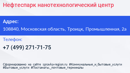 Нефтеспарк, нанотехнологический центр по адресу 108840, Московская область, Троицк, Промышленная, 2а в дальнейшем Организация, размещена в следующих категориях: