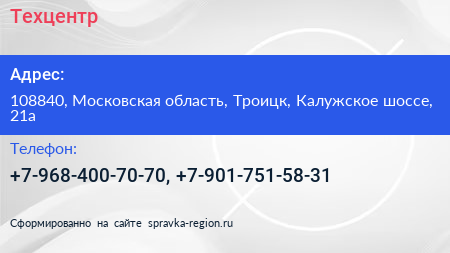 Техцентр по адресу 108840, Московская область, Троицк, Калужское шоссе, 21а в дальнейшем Организация, размещена в следующих категориях: