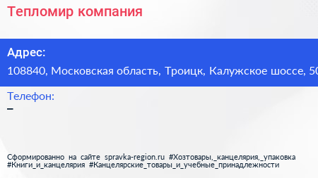Тепломир, компания по адресу 108840, Московская область, Троицк, Калужское шоссе, 50 в дальнейшем Организация, размещена в следующих категориях:
