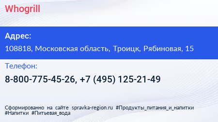 Whogrill по адресу 108818, Московская область, Троицк, Рябиновая, 15 в дальнейшем Организация, размещена в следующих категориях: