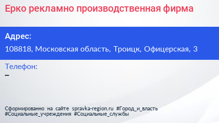 Ерко, рекламно-производственная фирма по адресу 108818, Московская область, Троицк, Офицерская, 3 в дальнейшем Организация, размещена в следующих категориях: