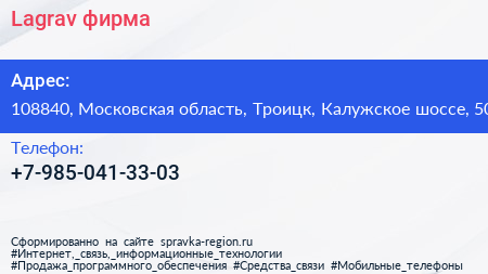 Lagrav, фирма по адресу 108840, Московская область, Троицк, Калужское шоссе, 50 в дальнейшем Организация, размещена в следующих категориях: