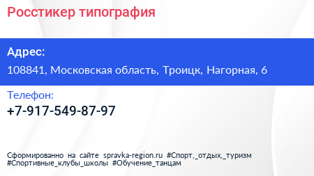 Росстикер, типография по адресу 108841, Московская область, Троицк, Нагорная, 6 в дальнейшем Организация, размещена в следующих категориях: