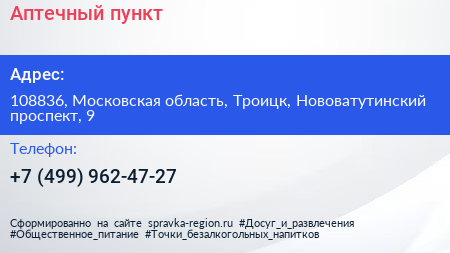 Аптечный пункт по адресу 108836, Московская область, Троицк, Нововатутинский проспект, 9 в дальнейшем Организация, размещена в следующих категориях:
