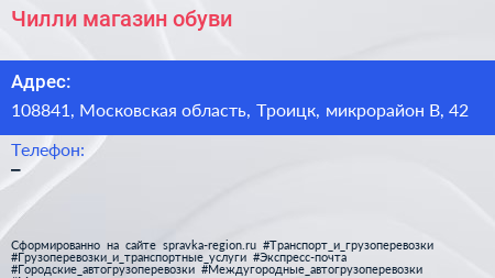 Чилли, магазин обуви по адресу 108841, Московская область, Троицк, микрорайон В, 42 в дальнейшем Организация, размещена в следующих категориях: