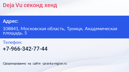 Deja Vu, секонд-хенд по адресу 108841, Московская область, Троицк, Академическая площадь, 5 в дальнейшем Организация, размещена в следующих категориях:
