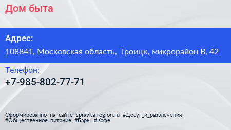 Дом быта по адресу 108841, Московская область, Троицк, микрорайон В, 42 в дальнейшем Организация, размещена в следующих категориях: