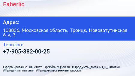 Faberlic по адресу 108836, Московская область, Троицк, Нововатутинская 6-я, 3 в дальнейшем Организация, размещена в следующих категориях: