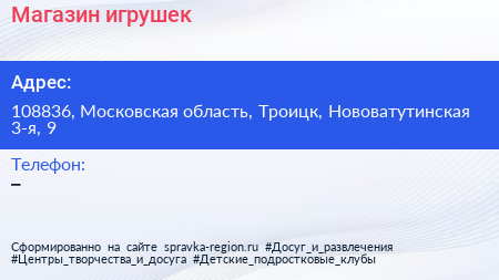 Магазин игрушек по адресу 108836, Московская область, Троицк, Нововатутинская 3-я, 9 в дальнейшем Организация, размещена в следующих категориях: