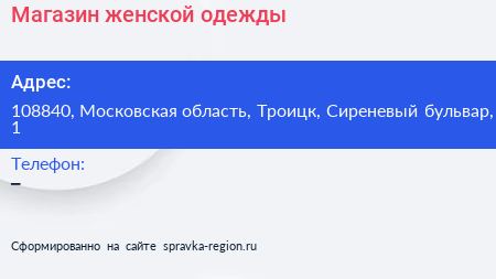 Магазин женской одежды по адресу 108840, Московская область, Троицк, Сиреневый бульвар, 1 в дальнейшем Организация, размещена в следующих категориях: