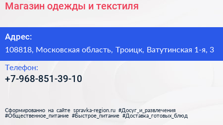 Магазин одежды и текстиля по адресу 108818, Московская область, Троицк, Ватутинская 1-я, 3 в дальнейшем Организация, размещена в следующих категориях: