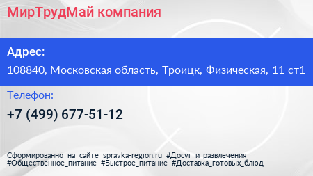 МирТрудМай, компания по адресу 108840, Московская область, Троицк, Физическая, 11 ст1 в дальнейшем Организация, размещена в следующих категориях: