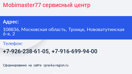 Mobimaster77, сервисный центр по адресу 108836, Московская область, Троицк, Нововатутинская 6-я, 2 в дальнейшем Организация, размещена в следующих категориях: