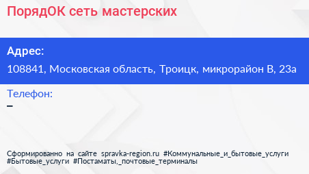ПорядОК, сеть мастерских по адресу 108841, Московская область, Троицк, микрорайон В, 23а в дальнейшем Организация, размещена в следующих категориях: