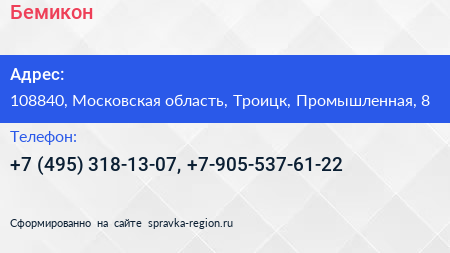 Бемикон по адресу 108840, Московская область, Троицк, Промышленная, 8 в дальнейшем Организация, размещена в следующих категориях: