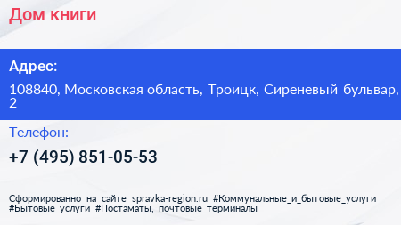 Дом книги по адресу 108840, Московская область, Троицк, Сиреневый бульвар, 2 в дальнейшем Организация, размещена в следующих категориях: