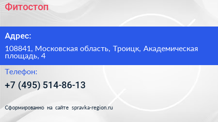 Фитостоп по адресу 108841, Московская область, Троицк, Академическая площадь, 4 в дальнейшем Организация, размещена в следующих категориях: