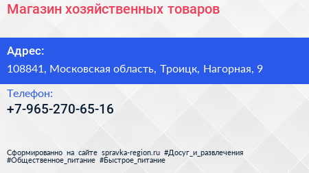 Магазин хозяйственных товаров по адресу 108841, Московская область, Троицк, Нагорная, 9 в дальнейшем Организация, размещена в следующих категориях: