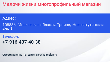 Мелочи жизни, многопрофильный магазин по адресу 108836, Московская область, Троицк, Нововатутинская 2-я, 1 в дальнейшем Организация, размещена в следующих категориях: