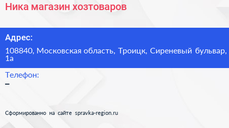 Ника, магазин хозтоваров по адресу 108840, Московская область, Троицк, Сиреневый бульвар, 1а в дальнейшем Организация, размещена в следующих категориях: