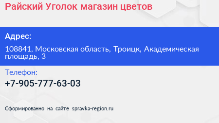 Райский Уголок, магазин цветов по адресу 108841, Московская область, Троицк, Академическая площадь, 3 в дальнейшем Организация, размещена в следующих категориях: