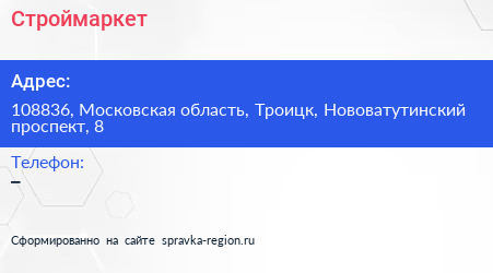 Строймаркет по адресу 108836, Московская область, Троицк, Нововатутинский проспект, 8 в дальнейшем Организация, размещена в следующих категориях:
