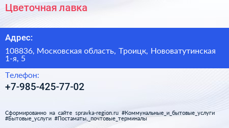 Цветочная лавка по адресу 108836, Московская область, Троицк, Нововатутинская 1-я, 5 в дальнейшем Организация, размещена в следующих категориях: